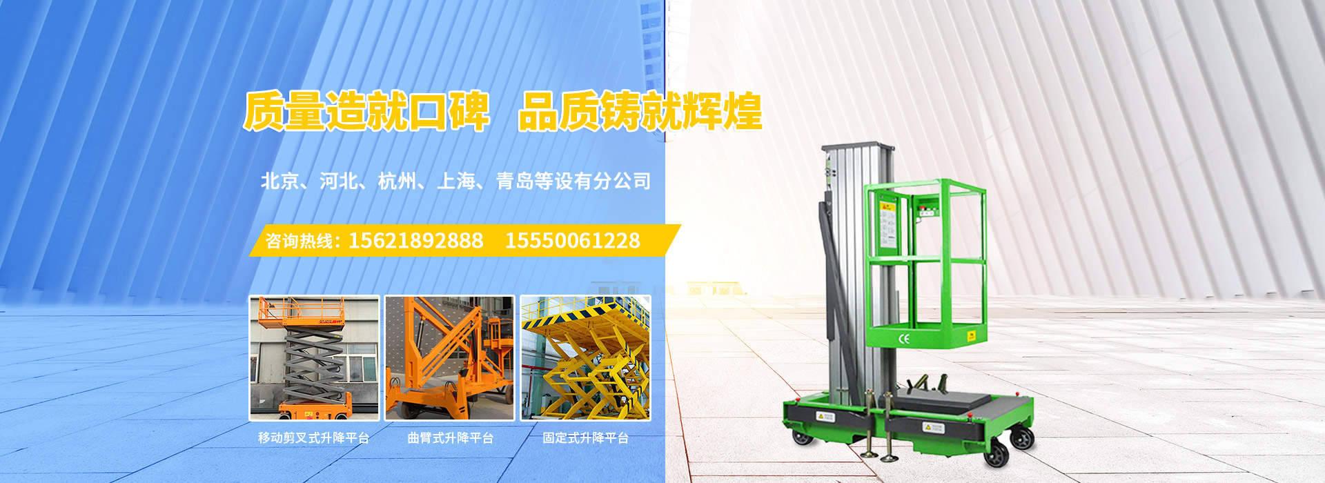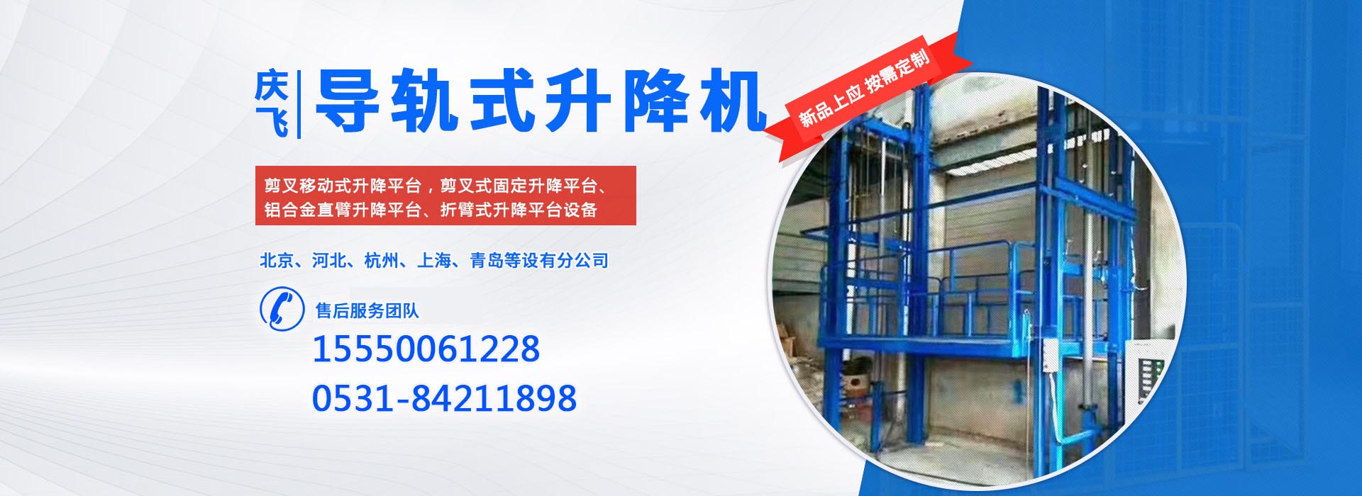 PRODUCT CRNTER濟(jì)南慶飛機(jī)械設(shè)備有限公司目前專心致力于液壓升降平臺領(lǐng)域。公司主要產(chǎn)品有:剪叉移動式升降平臺,剪叉式固定升降平臺、鋁合金直臂升降平臺、折臂式升降平臺、曲臂式升降平臺、車載式升降平臺、牽引式升降平臺、自動行走式升降平臺、移動式固定式登車橋、桅柱式鋁合金升降平臺、鋁合金升降舞臺、固定軌道臺面旋轉(zhuǎn)式升降平臺等,產(chǎn)品廣泛適用于電力、通訊、路燈、交通、交警、建筑裝簧、園林、廣告、高速公路、大型廠礦企業(yè)等領(lǐng)域,還可根據(jù)用戶的需求設(shè)計(jì)制造包括特殊尺寸、承載能力、防爆電器的液壓升降臺。